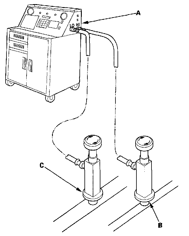 1. Connect a R-134a refrigerant recovery/recycling/ charging station (A) to the high-pressure service port (B) and the low-pressure service port (C), as shown, following the equipment manufacturer's instructions.