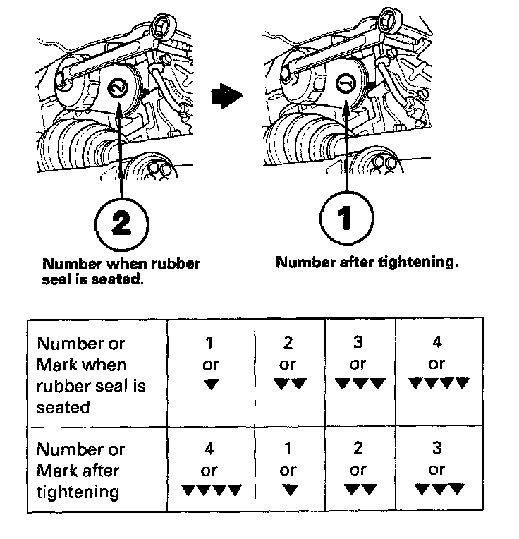 - Tighten the filter by turning it clockwise 3 numbers or marks from the one you noted. For example, if number 2 is at the bottom when the seal is seated, tighten the filter until the number 1 comes around the bottom.