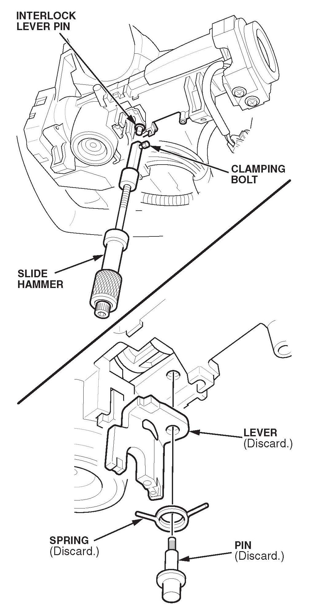 5. Attach the slide hammer to the interlock lever pin, and tighten the slide hammer clamping bolt. Then use the slide hammer to remove the pin. Discard the pin, the lever, and the spring.