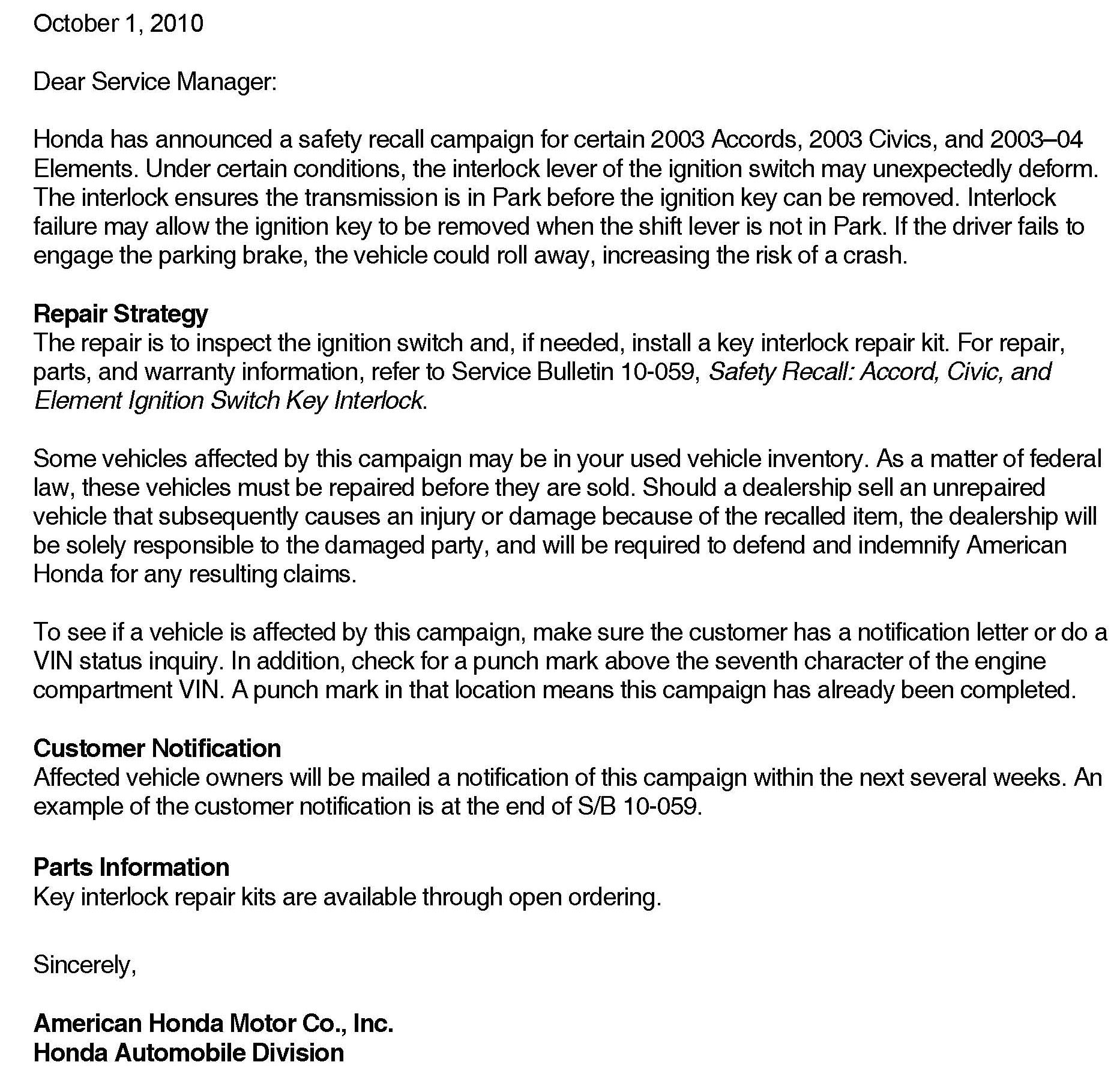 Recall - Ignition/Shift Interlock Defect