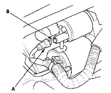 6. Make sure the transmission is in neutral, then disconnect the BLK/WHT wire (A) from the starter solenoid (B). Connect a jumper wire from the battery positive terminal to the solenoid terminal.