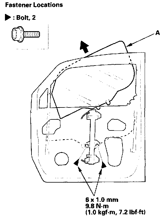 2. Carefully lower the glass (A) until you can see the bolts, then remove them. Carefully pull the glass out through the window slot. Take care not to drop the glass inside the door.