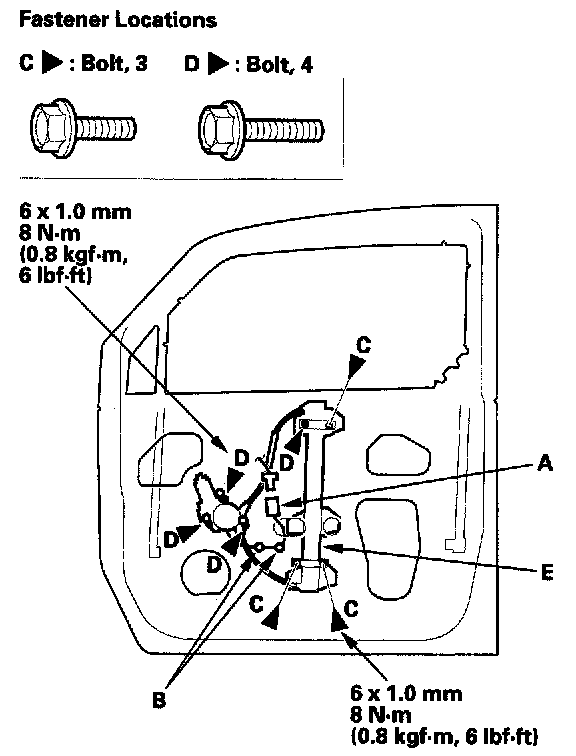 4. Remove the bolts (C), and loosen the bolts (D), then remove the regulator (E) through the hole in the door.