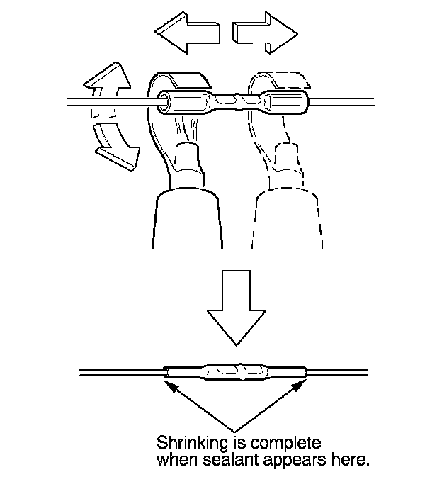 13. Plug in the heat gun, and turn it on. Start at the middle of the splice connector, and move the gun toward the ends as the tube shrinks. Apply heat evenly by rotating the curved heat spreader around the splice connector. Shrinking is complete when a small amount of sealant appears at each end of the tube.