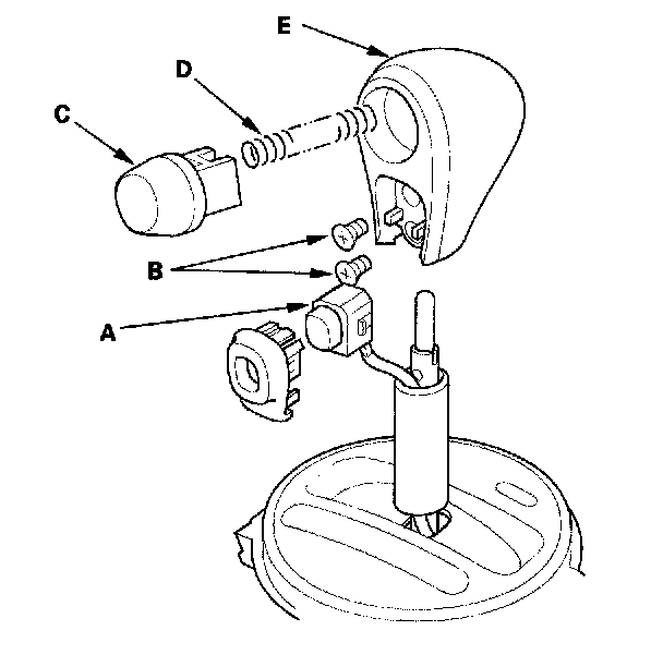 16. Remove the O/D switch (A) by expanding its locks, and remove the screws (B), shift lever button (C), spring (D), and shift lever knob (E).