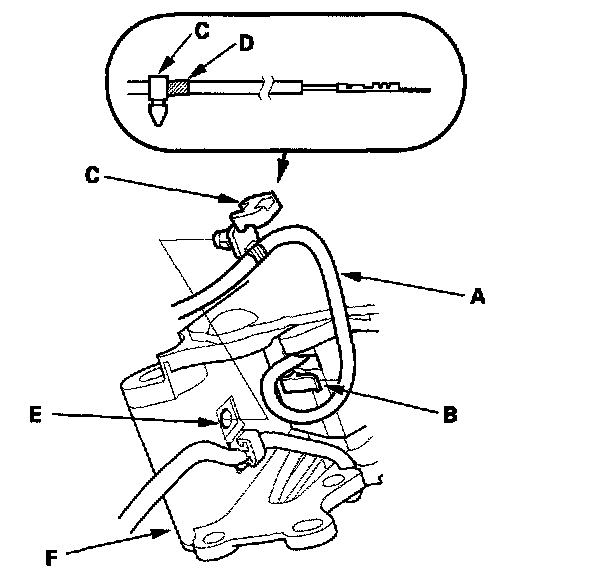 8. Rotate the socket holder (A) on the shift cable (B) a quarter turn; the tab (C) on the socket holder will be in the opening (D) of the shift cable bracket (E). Then slide the holder to remove the shift cable from the shift cable bracket. Do not remove the shift cable by twisting the shift cable guide (F) and damper (G).