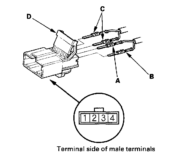 19. Remove the terminal (C) from the connector by pushing the lock tab (D) up in the connector using a thin blade screwdriver (E). Remove all four terminals.