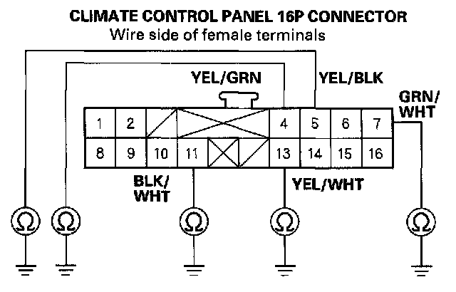 8. Check for continuity between the No.4, 5, 7,11 and 13 terminals of the climate control panel 16P connector and body ground individually.