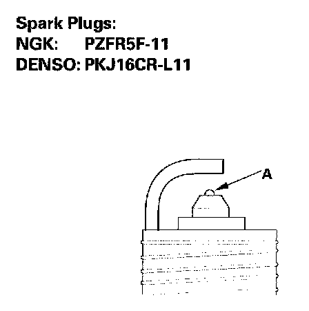 3. Replace the plug at the specified interval, or if the center electrode is rounded (A). Use only the spark plugs listed.