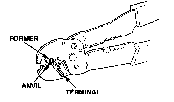 4. Position the terminal in the crimping tool slot with the solid portion of the terminal toward the anvil and the open section toward the former.