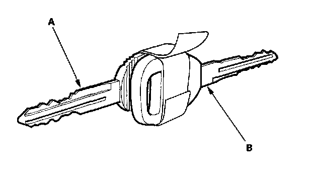 5. Tape the donor vehicle's ignition key head-to-head to the test vehicle's temporary key (A). The PCM will recognize the code from the donor vehicle's key (B) and allow you to start the engine with the temporary key.