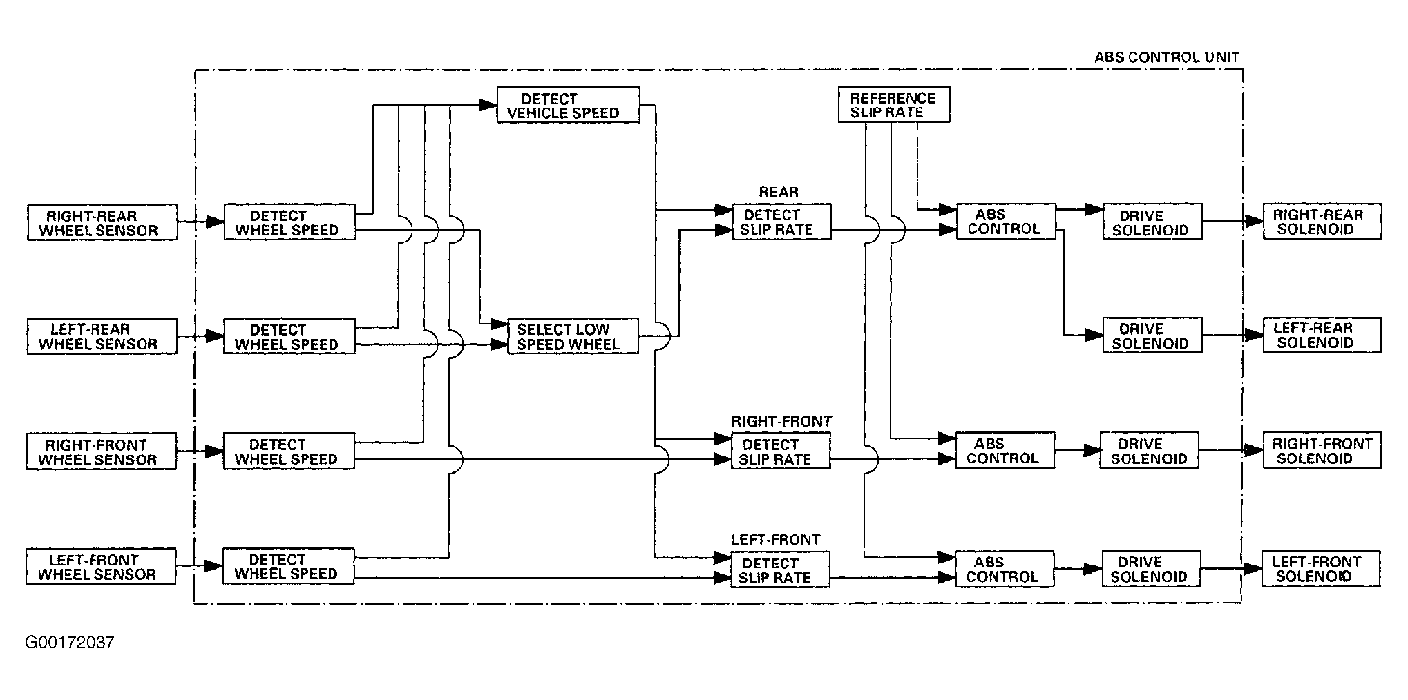 The ABS control unit detects the wheel speed based on the wheel sensor signal it received, then it calculates the vehicle speed based on the detected wheel speed. The control unit detects the vehicle speed during deceleration based on the rate of deceleration. See Figure . The ABS control unit calculates the slip rate of each wheel and transmits the control signal to the modulator unit solenoid valve when the slip rate is high. The pressure reduction control has three modes: pressure reducing, pressure retaining, and pressure intensifying.