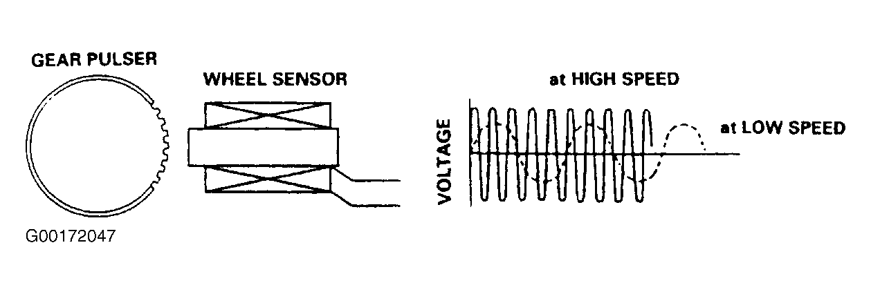 The wheel sensors are the magnetic contactless type. As the gear pulser teeth rotate past the wheel sensor's magnetic coil, AC current is generated. The AC frequency changes in accordance with the wheel speed. The ABS control unit detects the wheel sensor signal frequency and thereby detects the wheel speed. See Fig 1 .