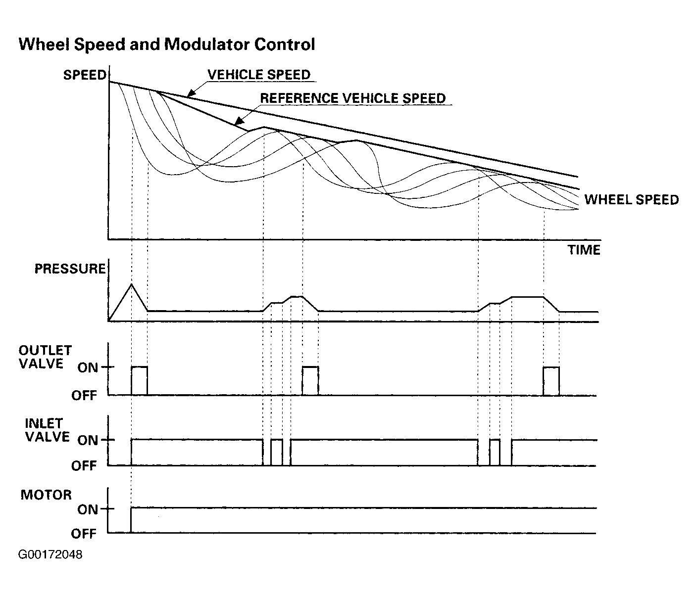When the wheel speed drops sharply below the vehicle speed, the outlet valve opens momentarily to reduce the caliper fluid pressure. The pump motor starts at this time. As the wheel speed is restored, the inlet valve opens momentarily to increase the caliper fluid pressure. See Fig 2 .
