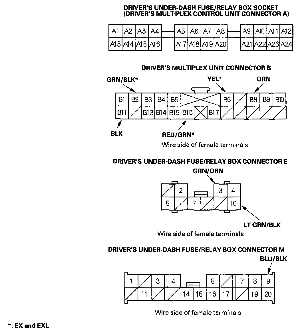 4. With the driver's multiplex control unit still disconnected, make these input tests at the connector and driver's under dash fuse/relay box sockets