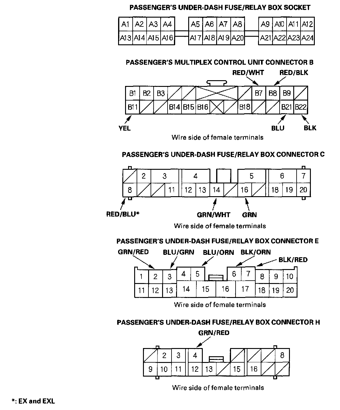 8. With the passenger's multiplex control unit still disconnected make these input tests at the connectors and the passenger's under dash fuse/relay box sockets