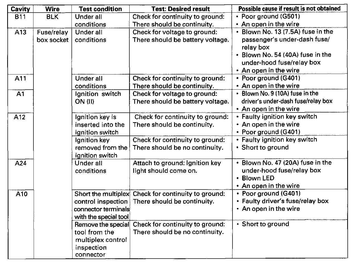 10. Make the following input tests at 22P connector Band the driver's under-dash fuse/relay box socket connector A. Be careful not to spread the fuse box connectors.