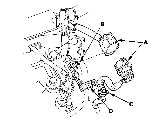 11. Install the harness clamp (C) on its bracket (D).
