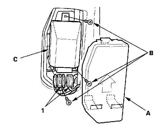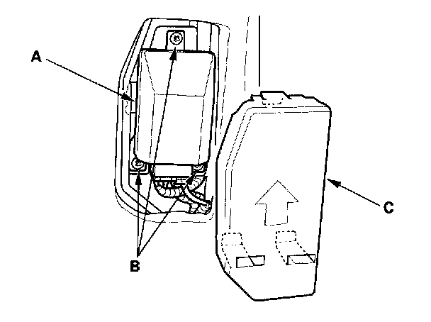 1. Place the new OPDS unit (A) on the seat-back frame Tighten the three screws (B), and connect the OPDS unit harness 8P and sensor connectors to the OPDS unit Reinstall the cover (C).