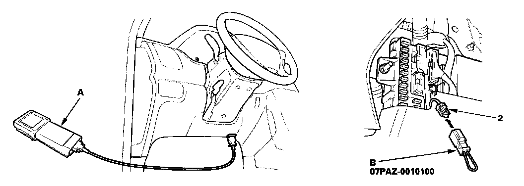 2. Connect the Honda PGM Tester (A) to the DLC (16P) (1), and follow the Tester's prompts in the "SCS" menu to ground the SCS line (see the Honda PGM Tester Operator's Manual).
