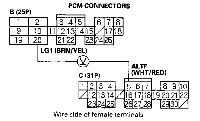 7. Measure voltage between PCM connector terminals B20 and C5.