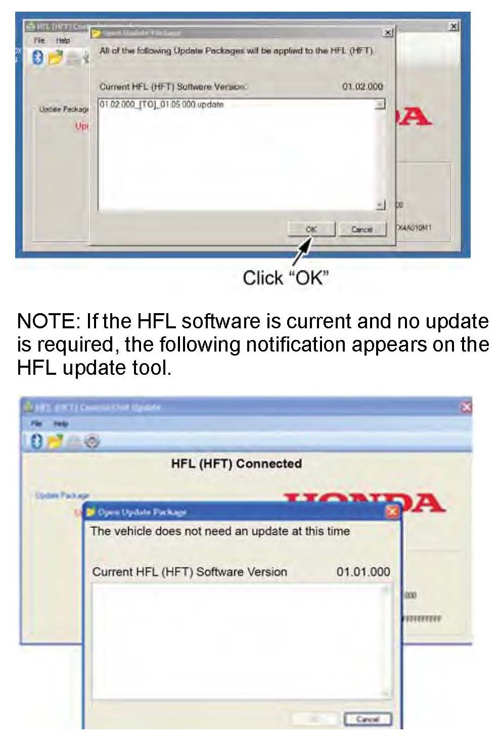 13. In the HFL update tool, the "Open Update Package" window pops up when the Bluetooth pairing process is complete. The HFL update tool automatically determines which version of the HFL software is present. The compatible updates will be displayed on the HFL update tool.