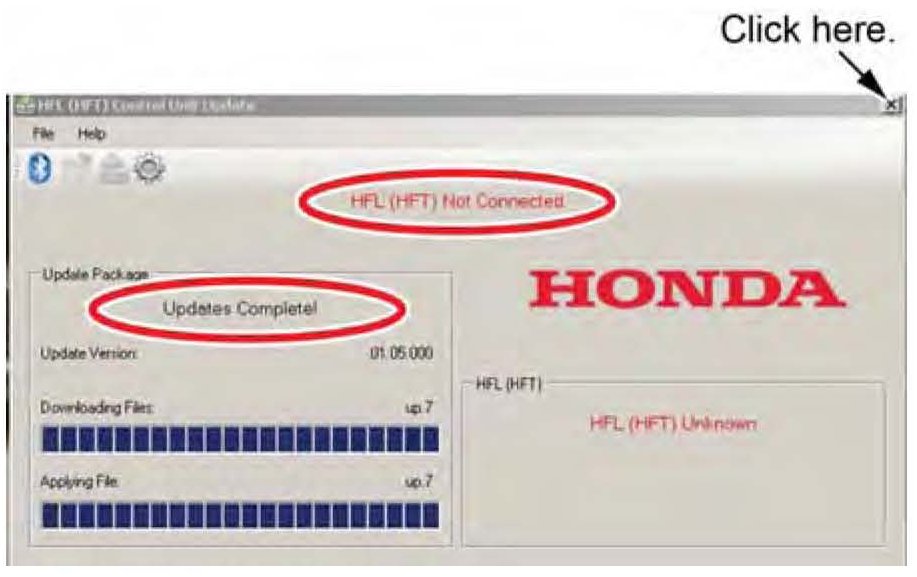 ^ If you see: "01.XX.XXX_(TO)_01.XX.XXX update," the PartNumberFix update is complete. You must now update the HFL control unit software. Go to HFL CONTROL UNIT UPDATE PROCEDURE - CR-V, Vehicles without Navigation.