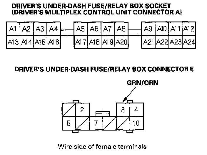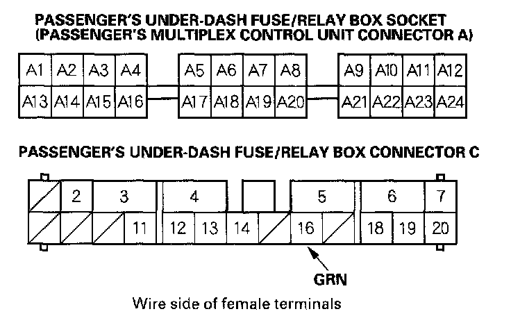 8. Remove the passenger's multiplex control unit from the passenger's under-dash fuse/relay box and connect fuse/ relay box socket terminal A12 to battery voltage. This turns the power window relay on.