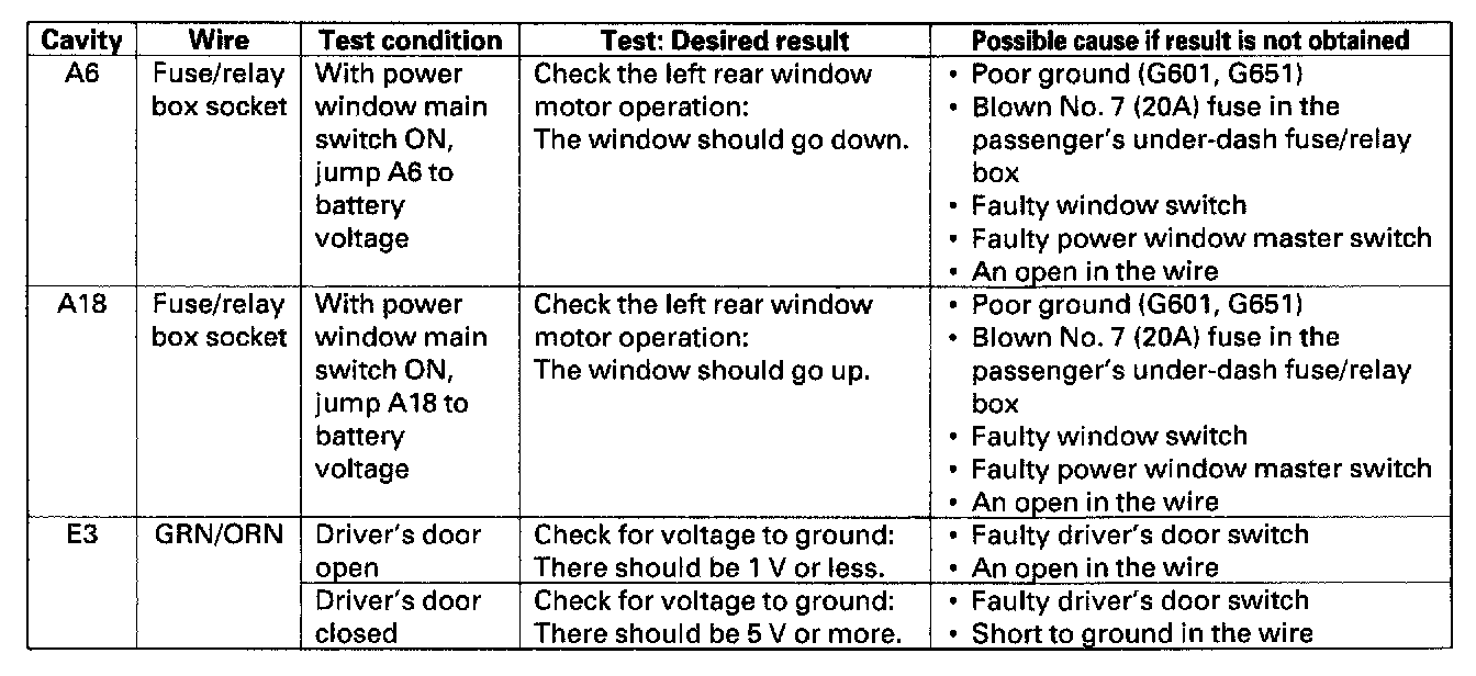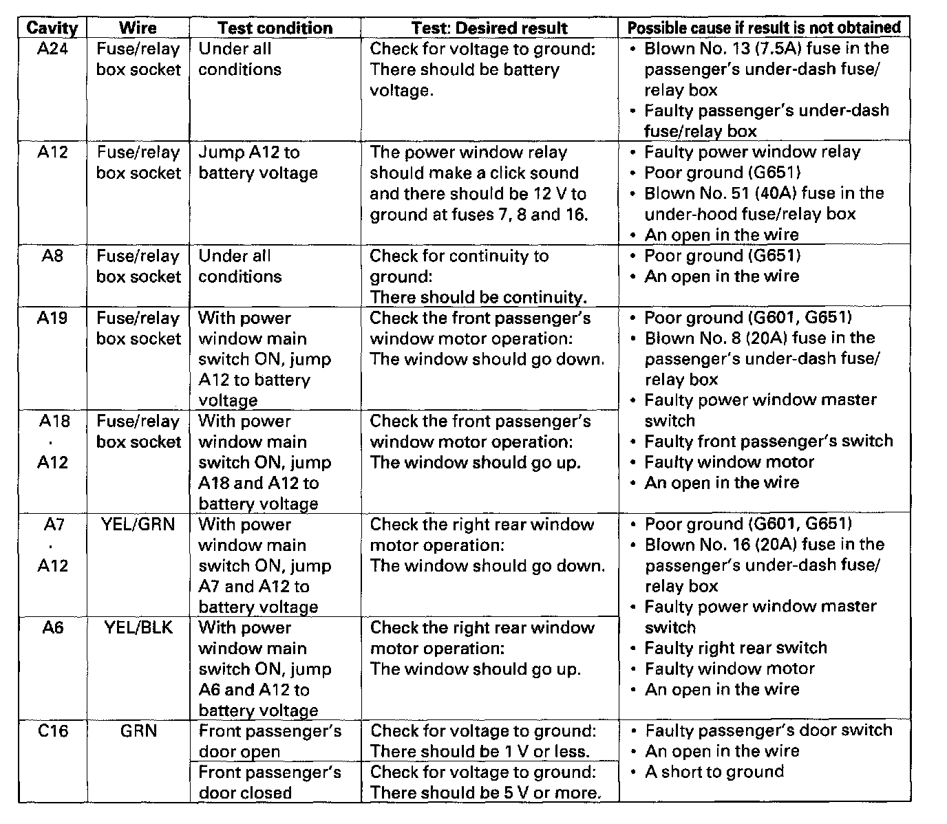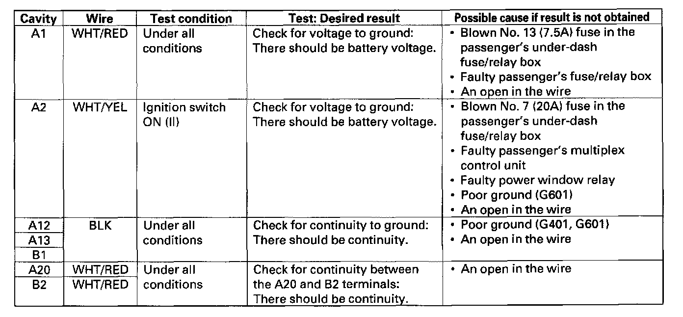 Home >> Honda >> 2003 >> Pilot V6-3.5L >> Repair and Diagnosis >> Windows and Glass >> Relays and Modules - Windows and Glass >> Power Window Control Module >> Testing and Inspection >> Pinout Values and Diagnostic Parameters >> Control Unit Input Test