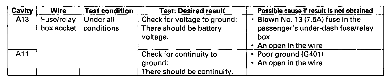 4. With the passenger's multiplex control unit still disconnected, make these input tests at the passenger's under-dash fuse/relay box socket.