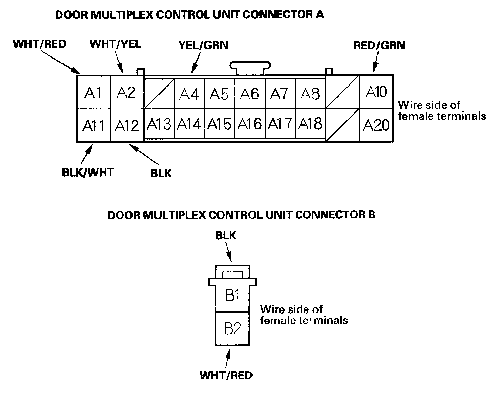 12. With the door multiplex control unit still disconnected, make these input tests at the connectors.