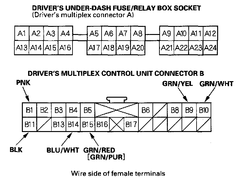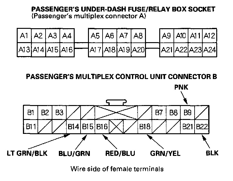 4. With the passenger's multiplex control unit still disconnected, make these input tests at the connector and passenger's under-dash fuse/relay box sockets.