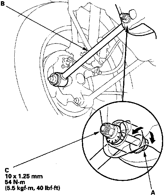 3. Loosen the tie-rod locknuts (A) while holding the flat surface sections (B) of the tie-rod end with a wrench, and turn both rack ends (C) until the front toe is within specifications.