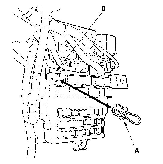4. Connect the MPCS Service connector (A) to the MCIC socket (B) in the under-dash fuse/relay box.