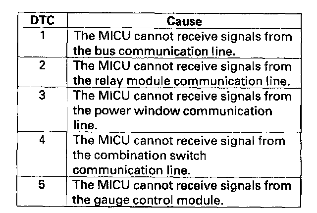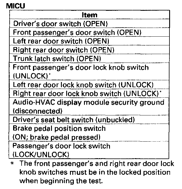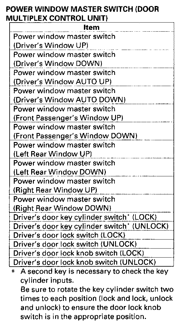 - DTC 3 only (no other DTCs present): Go to the door multiplex control unit input test. If all inputs are OK, substitute a known-good door multiplex control unit and then a MICU, one at a time, and then check for DTCs. If a DTC recurs after a substitution, replace that unit.
