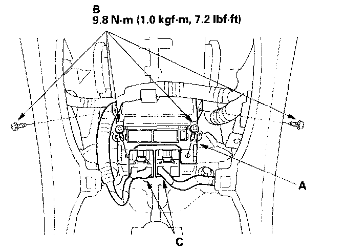 1. Install the new SRS unit (A) with Torx bolts (B), then connect the connectors (C) to the SRS unit; push them into position until they click.
