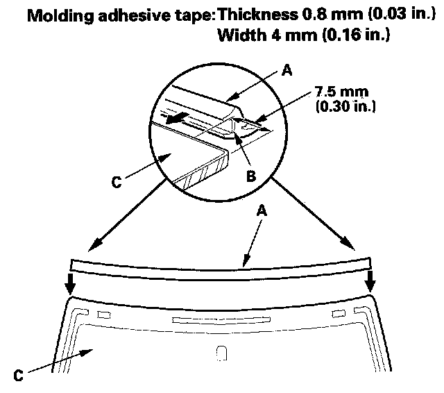 12. Attach the molding (A) with adhesive tape (B) to the upper edge of the windshield (C). Be careful not to touch the windshield where adhesive will be applied.