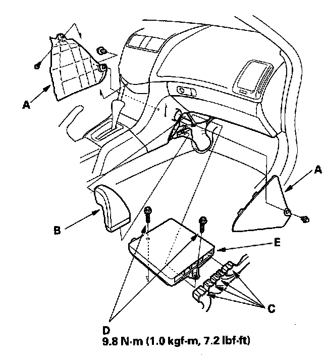 5. Remove the bolts (D), then remove the ECM/PCM (E).