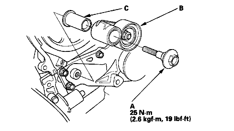 - 1 Hold the pulley with the holder handle (A) and holder attachment (B), then tighten the bolt to 64 Nm (6.5 kgf-m, 47 ft. lbs.) with a torque wrench and 19 mm socket (C).