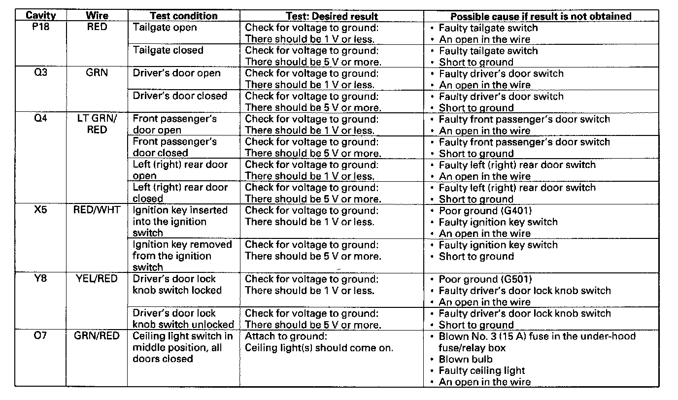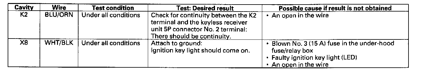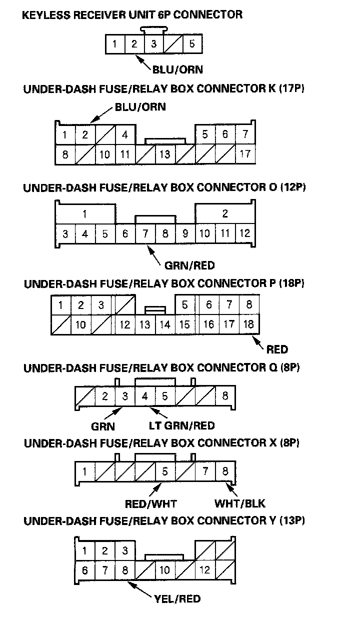 6. Reconnect the connectors to the under-dash fuse/relay box, and make sure these input tests at the appropriate connectors on the underdash fuse/relay box