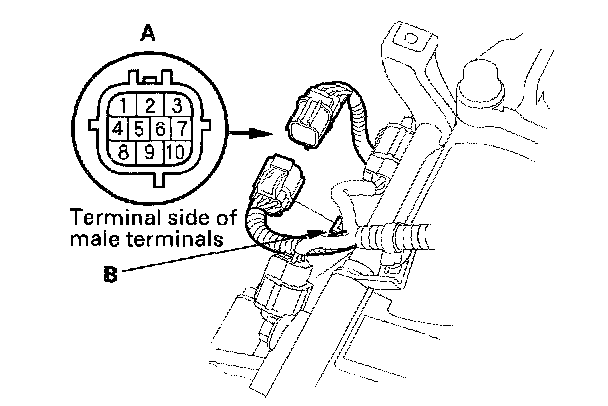 1. Remove the transmission range switch harness connector (A) from the connector bracket (B), then disconnect the connector.