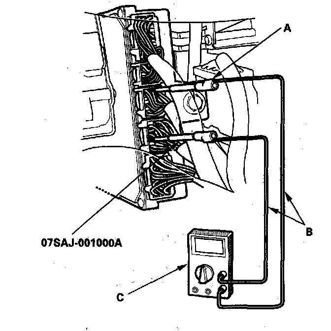 1. Connect the backprobe adapters (A) to the stacking patch cords (B), and connect the cords to a digital multimeter (C).