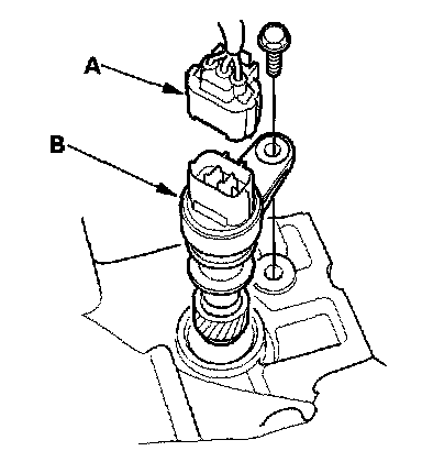 2. Disconnect the 3P connector (A) from the vehicle speed sensor (VSS) (B).