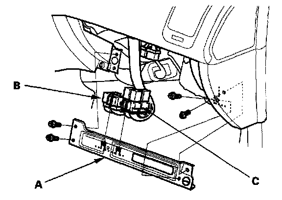 6. Remove the bolts and the glove box frame (A), then remove the connectors (B) and relay holder (C).