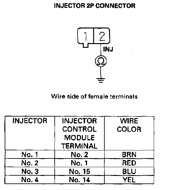 19. Measure resistance between each injector 2P connector terminal No.1 and No.2.