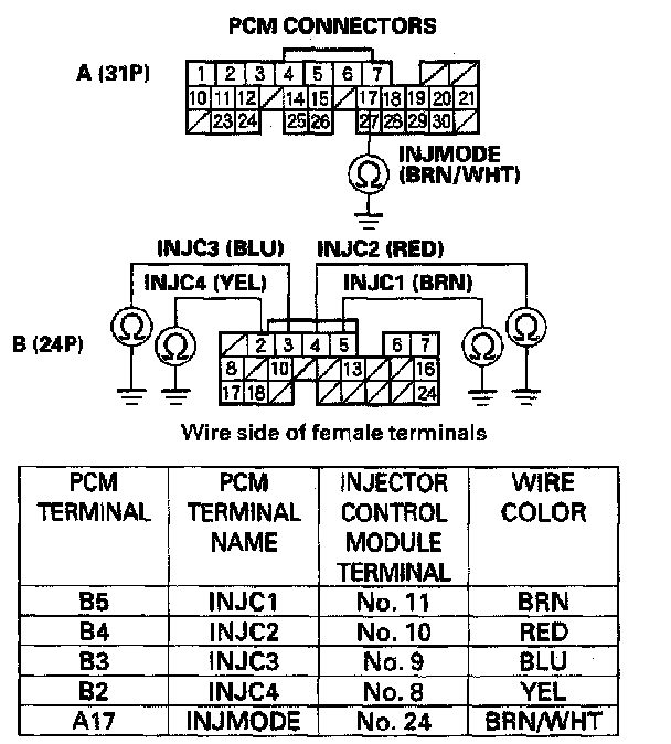 3. Check for continuity between each injectors control module terminal and body ground (see table).