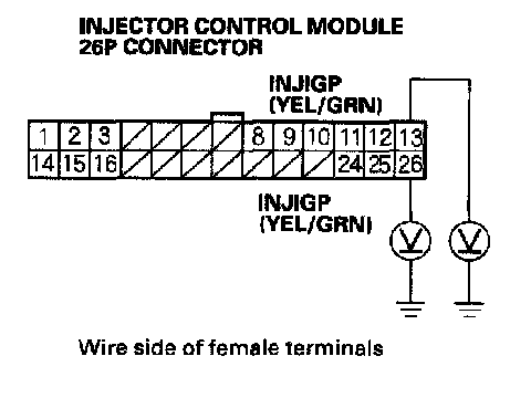 11. Turn the ignition switch ON (II), then measure voltage between body ground and injector control module 26P connector terminals No.13, No.26, and injector 2P connector terminal No.1 within the first 2 seconds after turning it ON (II).