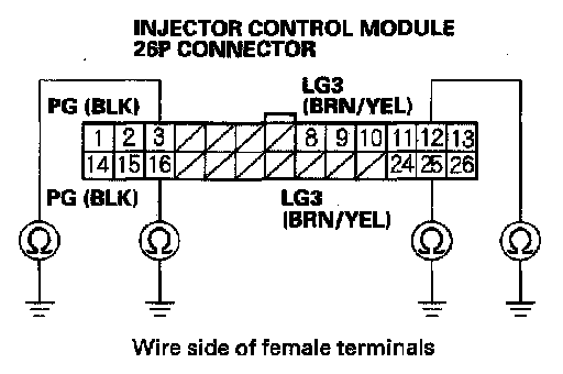 5. Check for continuity between body ground and the injector control module 26P connector terminals No.1, No.2, No.14 and No, 15.