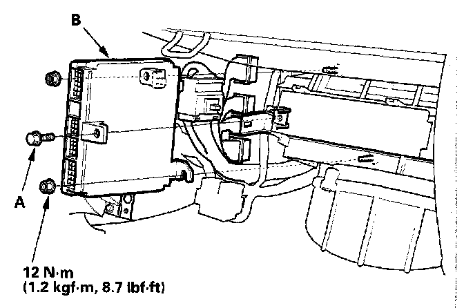 7. Remove the nuts, then remove the ECM/PCM (B).