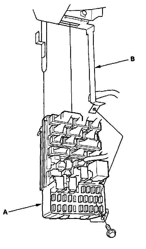 5. Remove the mounting bolt, and slide the under-dash fuse/relay box (A) down from the bracket (B).